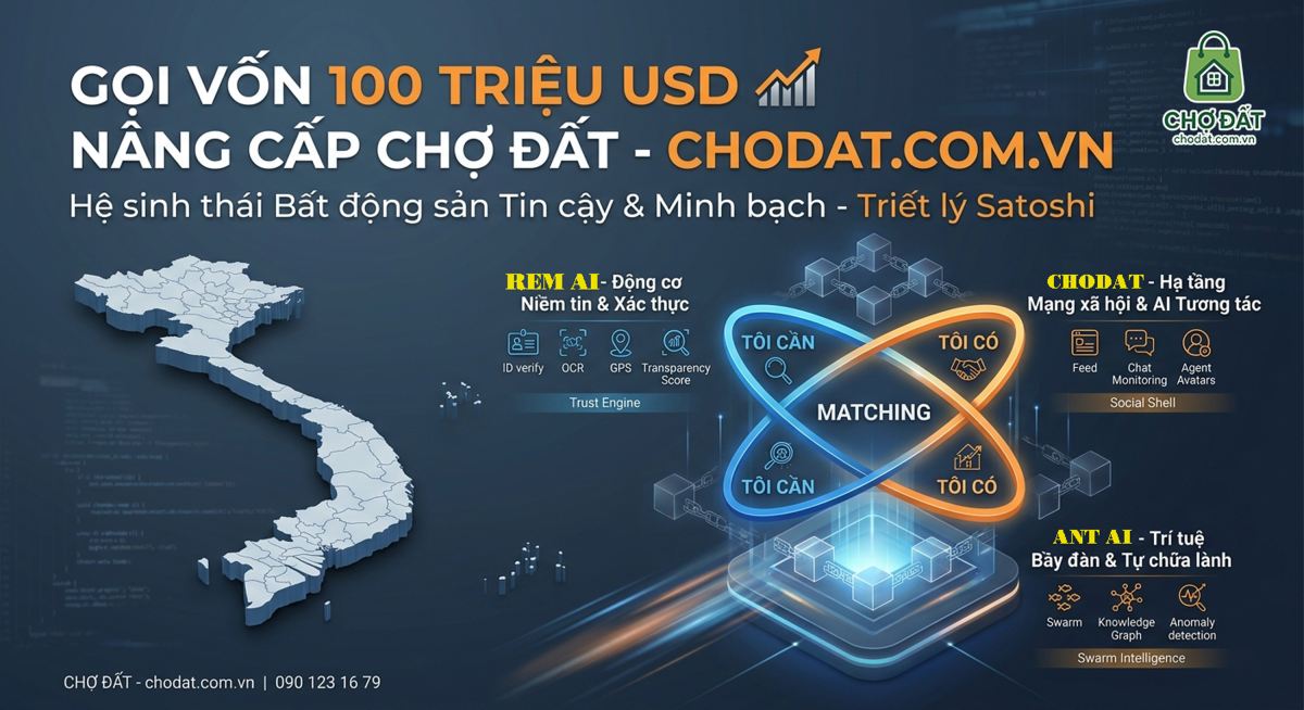 CHỢ ĐẤT (CHODAT.COM.VN): CHIẾN LƯỢC XÂY DỰNG "CỐI XAY" GIAO DỊCH BẤT ĐỘNG SẢN DỰA TRÊN TRÍ TUỆ NHÂN TẠO TỰ TRỊTác giả: Hệ thống Chợ Đất | Đơn vị: chodat.com.vn | Hotline: 090 123 16 79 Địa chỉ: 135/20 Nguyễn Cửu Vân, Phường Gia Định, TPHCM Thị trường bất động sản Việt Nam đang bước vào một kỷ nguyên bản lề. Những thay đổi cốt lõi từ Luật Đất đai 2024 cùng sự trỗi dậy của công nghệ PropTech đòi hỏi một cuộc thanh lọc toàn diện. Chợ Đất (chodat.com.vn) không ra mắt một bản cập nhật phần mềm thông thường. Chúng tôi đang kiến tạo một "Trust Engine" – Cỗ máy Niềm tin trị giá hàng trăm triệu USD, tái định nghĩa hoàn toàn cách thức khớp nối nhu cầu CẦN và CÓ trong giao dịch bất động sản dựa trên Trí tuệ Nhân tạo tự trị (Autonomous AI). 1. Tầm Nhìn Chiến Lược: Giải Quyết Nỗi Đau Thị Trường Bằng "Triết Lý Satoshi"Thị trường bất động sản Việt Nam hiện nay đang bị bủa vây bởi tin giả, "cò đất" thiếu tận tâm, tình trạng kê giá và sự thiếu minh bạch trong pháp lý. Cách tiếp cận truyền thống là cố gắng giáo dục thị trường hoặc thuê hàng ngàn nhân sự kiểm duyệt thủ công. Chợ Đất chọn một con đường khác biệt hoàn toàn: Thay đổi luật chơi dựa trên nguyên lý của Satoshi Nakamoto (cha đẻ Bitcoin). Chúng tôi không cố gắng ép buộc con người phải tốt lên. Thay vào đó, Chợ Đất thiết kế một hệ sinh thái kinh tế học hành vi (Game Theory), nơi sự trung thực là lựa chọn duy nhất mang lại lợi ích kinh tế cao nhất. Bước ngoặt lớn nhất của Chợ Đất là sự chuyển dịch từ mô hình "Giữ chân người dùng để bán quảng cáo" (Engagement-driven) sang mô hình "Giải quyết nhu cầu nhanh nhất để thu phí thành công" (Resolution-driven). Khi một nhà đầu tư đăng "Tôi CẦN một căn shophouse tại The Global City, pháp lý chuẩn, ngân sách 40 tỷ" và hệ thống lập tức ráp nối chính xác với người "Tôi CÓ", giao dịch được chốt, người dùng rời nền tảng trong sự hài lòng tuyệt đối. Đó chính là thước đo thành công của chúng tôi. 2. Bối Cảnh Vĩ Mô & Cơ Sở Hạ Tầng Pháp Lý 2024 - 2030Thị trường PropTech Việt Nam đang chứng kiến tốc độ tăng trưởng bùng nổ (CAGR 18,7%), dự báo quy mô giao dịch bất động sản vượt 47 tỷ USD vào năm 2025. Đặc biệt, sự ra đời của Luật Kinh doanh Bất động sản 2023 và Luật Đất đai 2024 (có hiệu lực từ 2025) đã thiết lập các tiêu chuẩn khắt khe mới về tính minh bạch: yêu cầu xác thực thông tin niêm yết, quy định tiền cọc không quá 5% giá trị hợp đồng nhà ở hình thành trong tương lai, và bắt buộc giao dịch qua ngân hàng. Sự hội tụ giữa pháp lý thắt chặt và sự trưởng thành của AI chính là "thời điểm vàng" để nền tảng cung cấp dịch vụ Trust-as-a-Service (Niềm tin như một dịch vụ) lên ngôi.